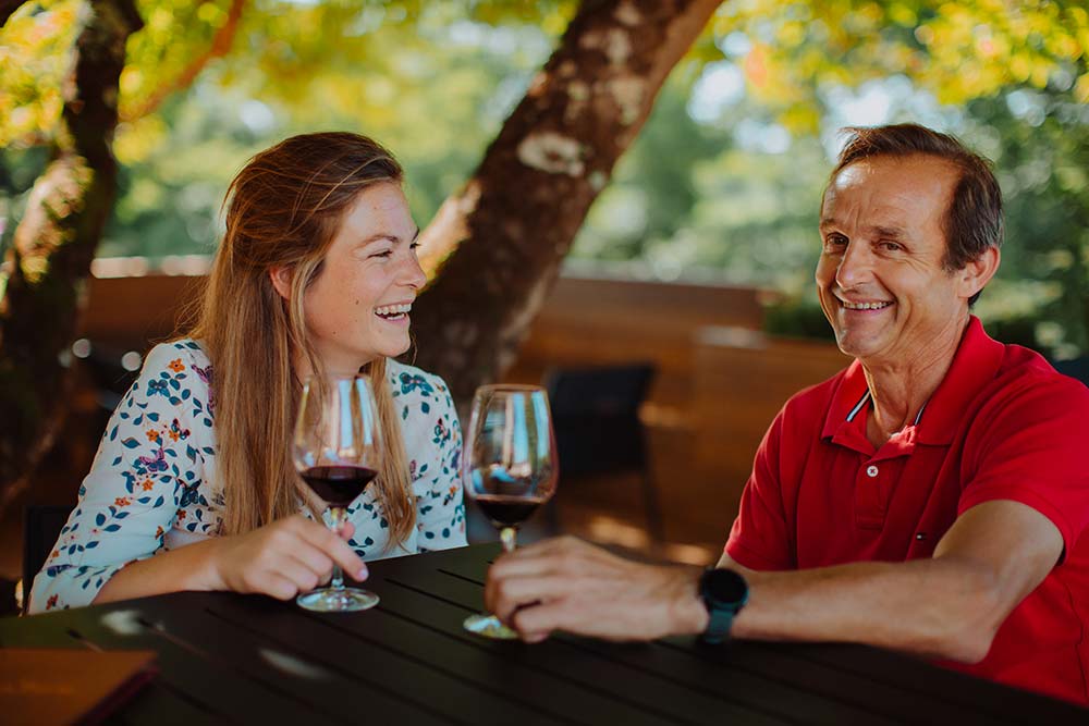 « À l’ombre d’un marronnier centenaire, la terrasse fleurie vous permet d’accéder directement à la dégustation des vins de la propriété en toute intimité. Des espaces de dégustations privatifs permettent à notre équipe de vous dédier ce moment. Les dégustations commencent systématiquement par une présentation de la propriété ainsi que les commentaires de dégustations de chaqu’un des vins servis. La qualité de votre expérience est notre priorité. »